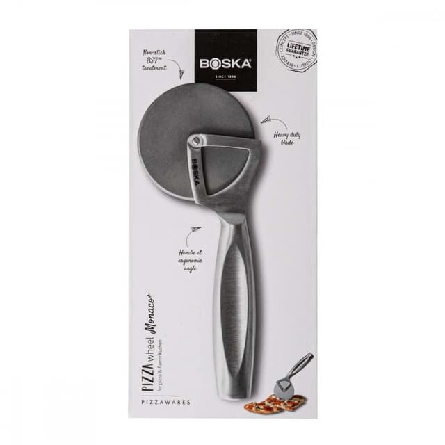 Skjær favorittpizzaen din i porsjoner med Pizzahjul Monaco+. Non-stick på grunn av BSF™-belegg og med et solid håndtak. Hele kutteren er laget av rustfritt stål av høy kvalitet og vingler ikke ved skjæring. Non-stick på grunn av BSF™ Vil du kutte pizzaen din uten at alt fester seg? Det er enkelt med dette pizzahjulet! Det spesielle BSF™-belegget gjør at pizzaskjæreren ikke klebrer. Denne kjemikaliefrie non-stick-overflaten forblir gjennom hele pizzahjulet sin lange levetid. Solid pizzakutter Pizzakuttere kan noen ganger være vinglete og ustabile. Men det er ikke denne! Det praktiske designet gjør at du enkelt kan skjære gjennom pizzaen og pizzabunnen. Håndtaket ligger godt i hånden og gir et prefekt grep og kontroll. Laget for å vare Etter bruk bør disse pizzahjulet vaskes for hånd. Litt såpevann er alt du trenger. Om BOSKA BOSKA lager ""Food Tools for Life"" og mener at kvalitet er bærekraft. Målet deres er å designe produkter som varer hele livet. Det hele begynte i nærheten av Gouda, i Holland, hvor smeden Willem Bos lagde sine første osteredskaper for de lokale bøndene. Fra den dagen har det vært en familientradisjon å lage morsomme og smarte redskaper slik at du kan nyte ost, sjokolade, pizza og mer. Så enten du skjærer, river, griller eller smelter, hjelper BOSKA deg med å lage appetittvekkende mat og en fest på bordet ditt. Vel bekomme!