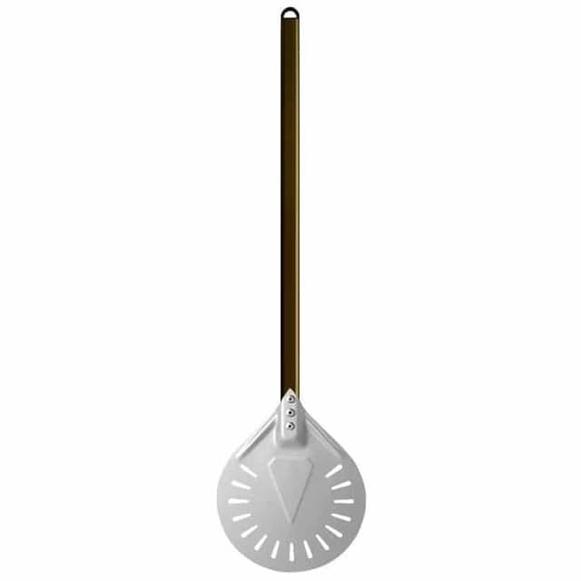 Turning peel utført i anode oxydert aluminium , perfortert spade og alu handtak . passer perfekt til mindre ovner som Ooni og Effeuno. Perfekt spade til rotasjon av pizza mens den ligger i ovnen.Benyttes også til å ta ut ferdigstekt pizza fra ovnen.