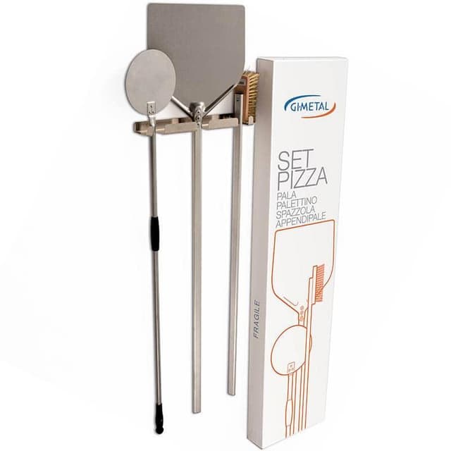 Settet består av: pizzaspade, pizzapeeler messing sope og veggholder for oppbevaring av settet på en organisert måte.