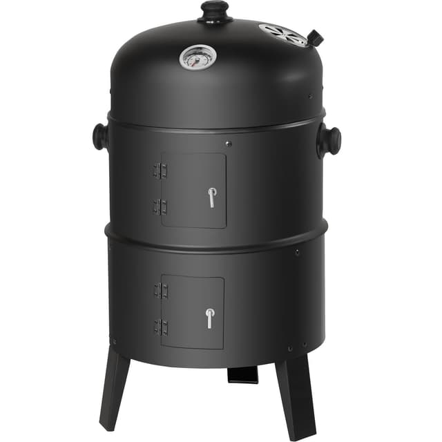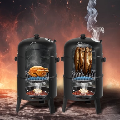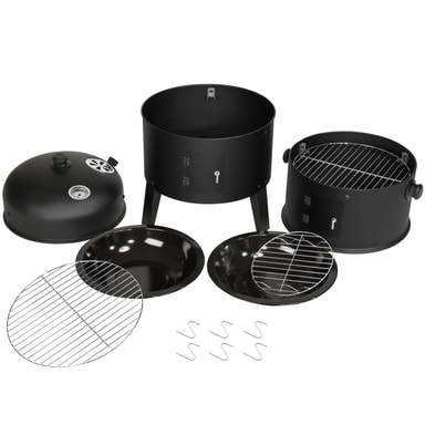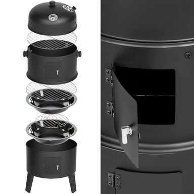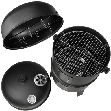 Vår allsidige trekullgrill med 3 ulike nivåer for grilling, tilberedning og røyking er et must for alle grillfantaster. Gjennom begge gitterne (diameter 37 cm) har du tilstrekkelig plass for å grille til familien, venner eller naboer. En termometer på lokket viser temperaturen, som kan reguleres nøye ved hjelp av lukene på sidene og det øvre spjeldet. Den innebygde vannskålen holder temperaturen konstant lav for perfekt røyking, eller så kan den brukes for dampkoking av grønnsaker. Den raske monteringen og den enkle håndhevelsen garanterer en ekte grillopplevelse.