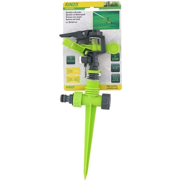 Roterbar impulssprinkler med jordspyd for en perfekt vannning av plenen og hageplantene. Rekkevidde opp til 20 m med 360° roterende sprayfeste. Spraymønster i hel sirkel eller sektor. Du kan styre strålen og stille inn spraymønsteret ved hjelp av sektorbegrenseren.