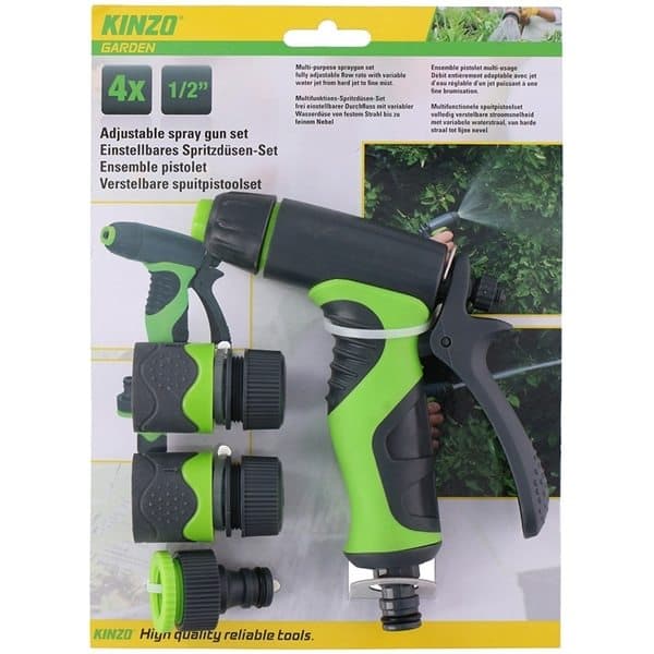 Vannesett med justerbar sprøytepistol og tre koblinger. Du kan forandre vannhastigheten fra hard jetstråle til fin dusj. Hendig når du vil bruke spraypistolen for to forskjellige oppgaver som for eksempel å vanne blomstene og vaske bilen.