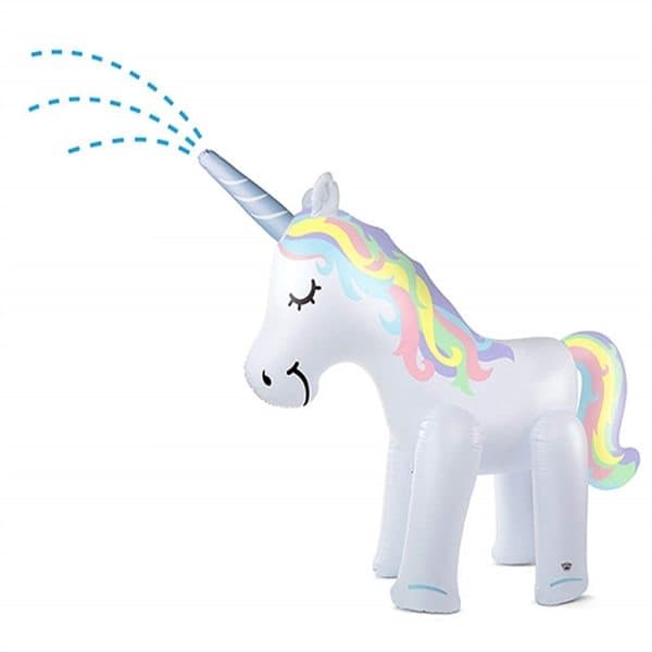 Skap en eventyrlig stemning i hagen med denne gigantiske vannsprøytende enhjørning. Blås opp enhjørningen, koble inn hageslangen og helt magisk begynner vann å sprøyte fra enhjørningens horn. Perfekt for lek og avkjøling under varme dager og garantert en hit på sommerens barneselskap og fester.