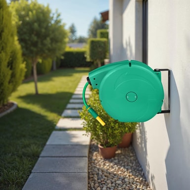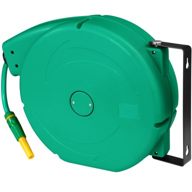 Lei av hageslange i en stor floke og kronglete vanning? Gjør hagearbeidet enklere med den praktiske slangetrommelen fra tectake. Slangen er enkel å trekke ut og har slangestopp slik at du kun har ute så mye slange som du behøver. Siden veggbeslaget kan dreies 180 °, kommer du til med slangen alle steder du ønsker å vanne og slipper at slangen får en knekk som stopper vannforsyningen. Takket være den automatiske opprullingsmekanismen, rulles slangen enkelt inn i den robuste boksen og du slipper å snuble i en stor floke av hageslangen. Den praktiske slangetrommelen fra tectake gjør hagevanningen til en trivelig kveldsaktivitet.