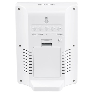 To-delt sett med en basestasjon og en trådløs utendørssensor for visning av tid, dato, temperatur, luftfuktighet og værmelding.