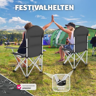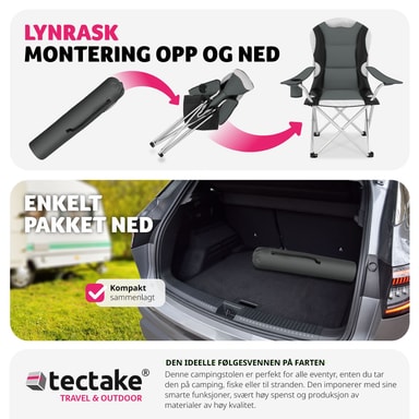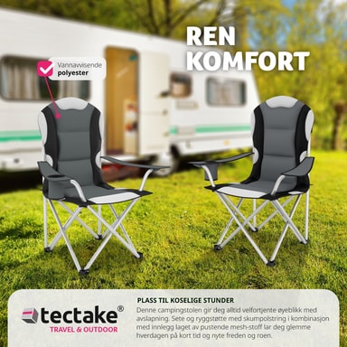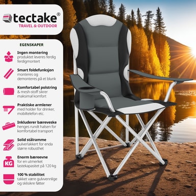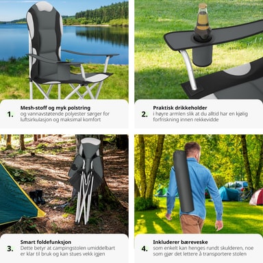 Denne campingstolen er en perfekt ledsager til alle dine fritidsaktiviteter, uansett om det handler om campingutflukter, fiske, strandferie eller i hagen. Len deg tilbake, nyt roen og naturen i denne sammenleggbare campingstolen. Den komfortable foringen gjør det enda bedre. Kalde drikker kan du enkelt plassere i den innebygde drikkeholderen. Etter en avslappende dag, kan du rett og slett legge sammen stolen og ta den med hjem i den medfølgende bærevesken.