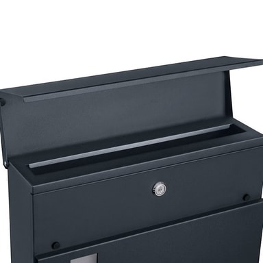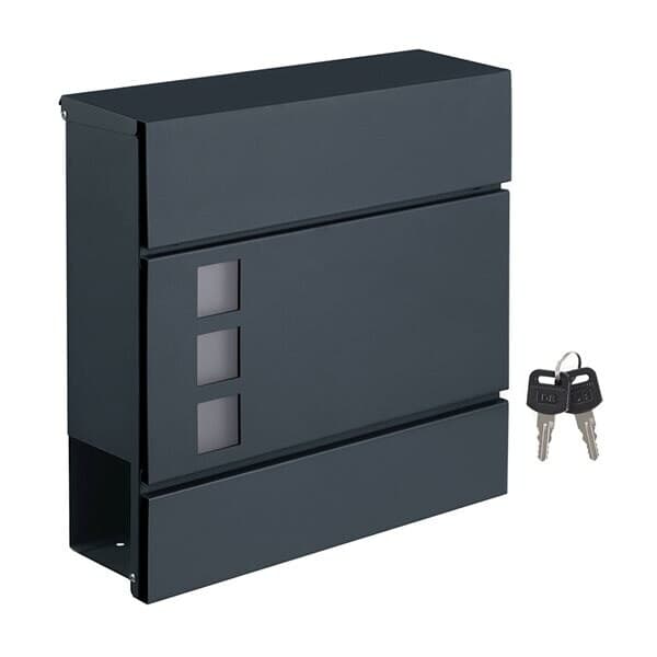 Denne stilige postkassen kombinerer funksjonalitet med moderne design. De slanke linjene og den antrasittgrå fargen passer perfekt sammen med moderne fasader og inngangsdører. Den integrerte magasinholderen gjør det enkelt å oppbevare aviser og magasiner uten å måtte blande dem med annen post.