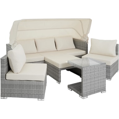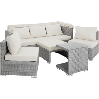Dette innbydende loungesettet i rotting fra tectake har supermyk polstring, utfellbar solbeskyttelse og justerbare ryggstøtter for optimal avkjøling og avslapning. De individuelle elementene i dette sjenerøse settet kan grupperes slik du vil for å gi hjemmet ditt et personlig preg. Takket være de individuelle elementene kan disse rotting hagemøblene formes som en kube, hjørnesett og mye mer. Sofaens lange bredde gir et flott område for avslapning, mens de ekstra stolene og krakken gir plass til å strekke seg ut i optimal komfort. Sofaen, stolen og krakken, med puter, og det overhengende sidebordet leveres ferdig montert. Den slitesterke polyrottingveven av høy kvalitet og den stabile aluminiumsbasen gjør dette lettstelte salongsettet i rotting til det perfekte utemøblet. Gjør hagen eller terrassen din til en friluftsstue med dette salongsettet for hagemøbler i rotting fra tectake.