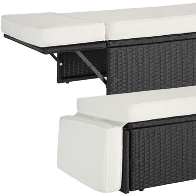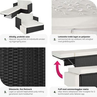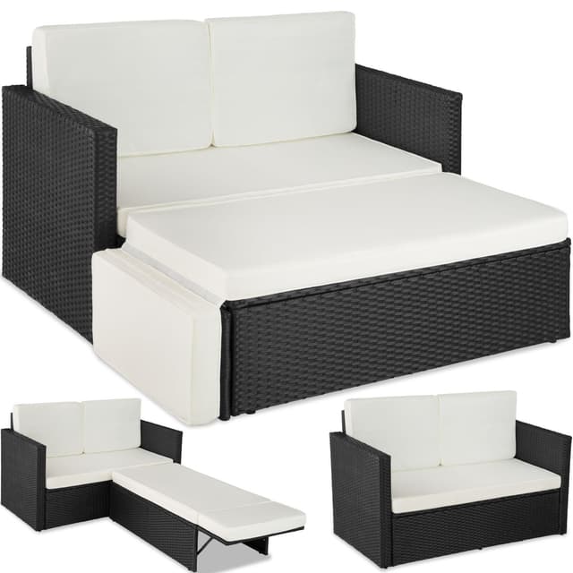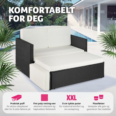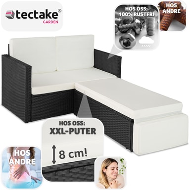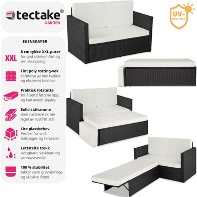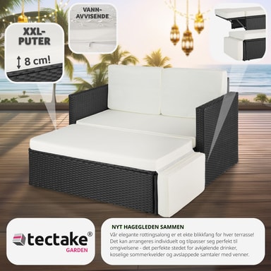 Den stilige dobbeltsofaen i rotting fra tectake tilbyr med sine tykke puter høy sittekomfort og dermed en ideell atmosfære for avslapning og samtaler i det fri. Den store puffen med den utbrettbare støtten kan helt etter ønske settes sammen til en fotskammel eller en benk for å passe sammen med sofaen. Monteringen er ukomplisert og gjøres unna raskt. I bruk er det smuss- og vannavvisende hagemøbelet lett å holde rent med en fuktet klut. Det fine flettverket i slitesterk polyrotting og den stødige rammen i pulverlakkert stål gjør at denne holdbare dobbeltsofaen i rotting fra tectake utmerker seg.