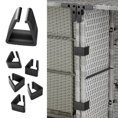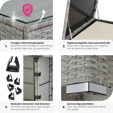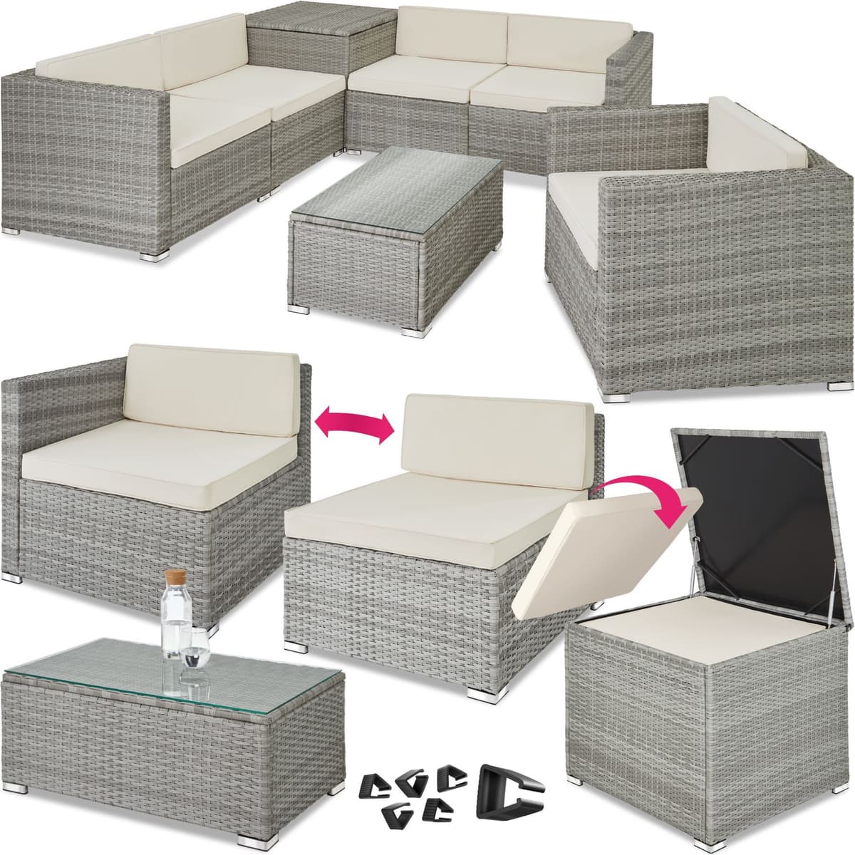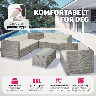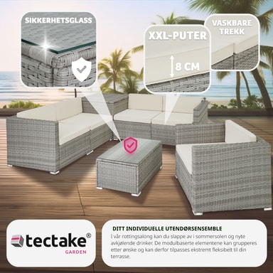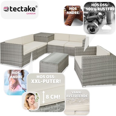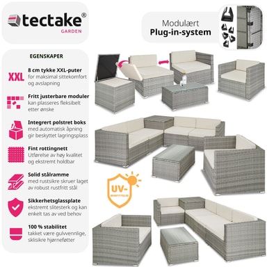 Det koselige hagemøbelsettet Pisa i rotting fra tectake er et multifunksjonelt ensemble av 5 sofastoler, 1 bord og 1 oppbevaringsboks som kan ordnes for å passe til din plass. Den slitesterke metallrammen og polyrottingoverflatene sørger for at møblene er enkle å ta vare på, mens de myke sofa- og stolputene gir komfort. Utendørssofaene og lenestolen med salongbord setter en varm stemning for middag eller å sette føttene opp, og du kan oppbevare tepper eller tilbehør i den praktiske oppbevaringsboksen. Et flott alternativ for uteservering i ethvert hjem eller hage. Ett design – mange muligheter. Lag ubegrensede kombinasjoner for hjemmet ditt med dette Pisa rotting hagemøbelsettet fra tectake.
