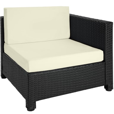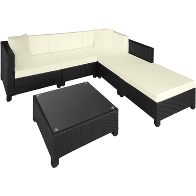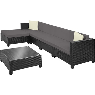 Dette setesettet med hagemøbler i rotting bestående av bord, sofa og lenestol er laget av aluminium og dekket med polyrotting. Dette resulterer i lav vekt, uten at det går på bekostning av stabiliteten. Bordflaten laget av glass ser ekstremt stilig ut og er enkel å rengjøre. De svært komfortable sitteputene laget av polyester er perfekt fargekoordinert med det sorte rottingsettet og har en glidelås på baksiden som gjør det enkelt å rengjøre. For å beskytte polstringen mot fuktighet og smuss, er overflaten impregnert. Gjennom de ulike enkeltelementene kan settet ordnes etter dine ønsker. Bestill dette vakre salonghagemøbelsettet fra Tectake og forsterk din utendørs hage eller uteplass.