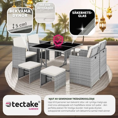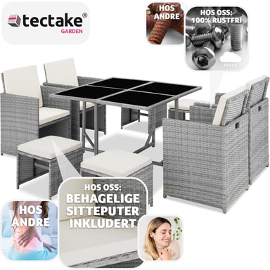 Bilbao rottingsettet fra tectake vil tillate deg å nyte utendørs matopplevelser i hagen, på terrassen eller i vinterhagen i mange år framover. Polyrottingmaterialet som ble brukt er spesielt designet for hagemøbler.Les mer om produktet