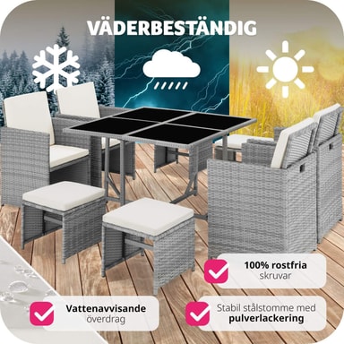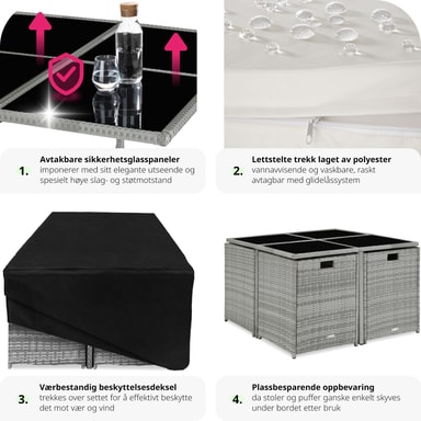 • Materiale: Sittegruppe av polyetylen, stålrammer, rustfrie skruer, overtrekk og foring av 100 % polyester