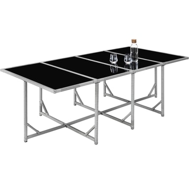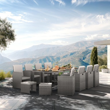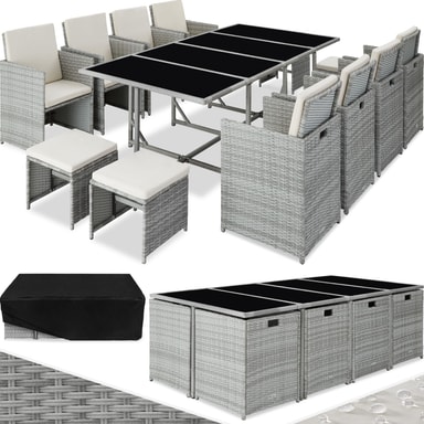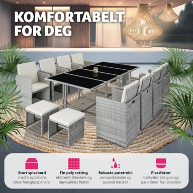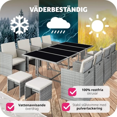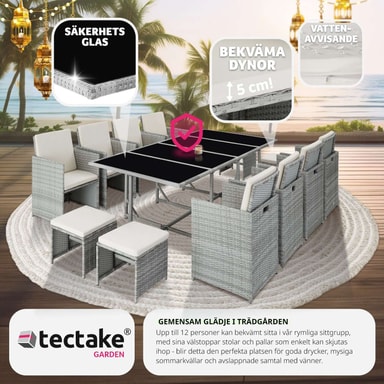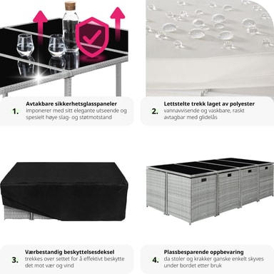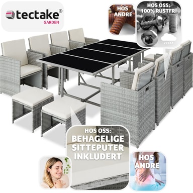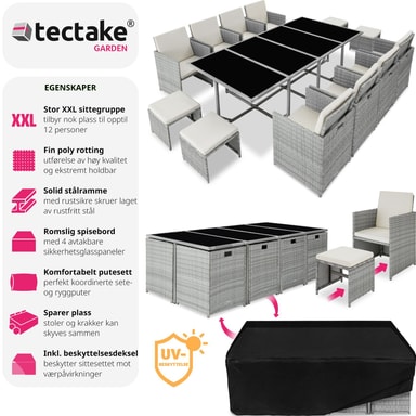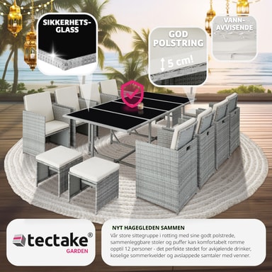 Dette Palma hagerotting møbelsettet fra tectake er perfekt for å skape et sentralt samlingspunkt for hagefester og sosiale sammenkomster med familie og venner i hjemmet ditt. Polyrottingmaterialet som ble brukt er spesielt designet for hagemøbler. Polyrotting er den overordnede betegnelsen for kunstig produserte vevde materialer laget av polyetylen som representerer et industrielt produsert alternativ til naturlig rotting. Ditt nye setesett er dermed vaskbart, lettstelt og værbestandig. Stolene og puffene har polstrede puter som er vannavstøtende, avtakbare og enkle å rengjøre med de innebygde glidelåsene. Den herdede glassplaten er malt svart på bunnen og lover derfor et elegant utseende. Lenestolene har en håndtaksutsparing på kanten, slik at de enkelt kan flyttes. Ved hjelp av den sammenleggbare ryggstøtten kan lenestol og puff kombineres kompakt i et modulsystem for å spare plass. Det medfølgende regntrekket gir ekstra beskyttelse slik at du får glede av dette flotte stolsettet i lang tid fremover. Det lettstelte ensemblet er stabilt og holdbart takket være den robuste stålrammen, noe som betyr at du kan nyte utendørs matopplevelser på terrassen, ute i hagen eller i vinterhagen i mange år framover. Dette hagerottingmøbelsettet fra tectake er perfekt for bruk i hjemmet ditt og kan brukes til fester, avslappende eller stjerneopplyste middager.