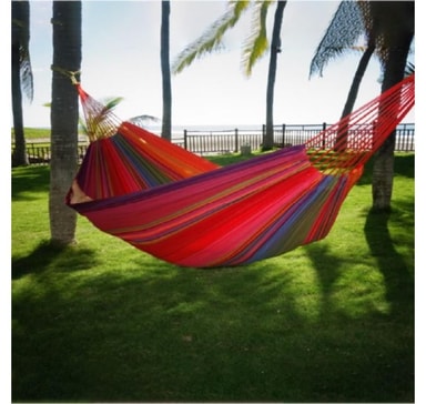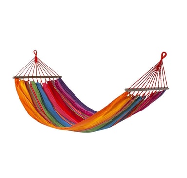 Hengekøye NIKOLINA rød stripete. Hengekøyen er håndlaget av håndverkere fra El Salvador, med respekt for den eldgamle kulturen og tradisjonelle teknikker. Bomullsstoffet er håndvevd. Fargeskalaen er inspirert av lokal natur. Polyestersnorer sikrer bedre holdbarhet og styrke på hengekøyen. Husken kan monteres mellom to trær eller stolper. Det er også mulig å bruke et spesielt hengekøyestativ for å henge husken opp. Avstanden mellom festepunktene skal være minst 25-30 cm lengre enn huskens totale lengde. Dimensjonene på husken er 127x230 / 320cm, maksimal lastekapasitet er 120kg. VEDLIKEHOLD: For å forlenge levetiden til produktet er det viktig å beskytte det mot vær og vind. Holdbarheten til stoffet og snorene reduseres på grunn av UV-stråling og overdreven fuktighet, og fargene blekner. Vi anbefaler alltid å oppbevare husken i et tørt og godt ventilert rom etter bruk. La husken tørke helt før du oppbevarer den. Håndvask på 40 grader er tillatt. Bruk milde vaskemidler.