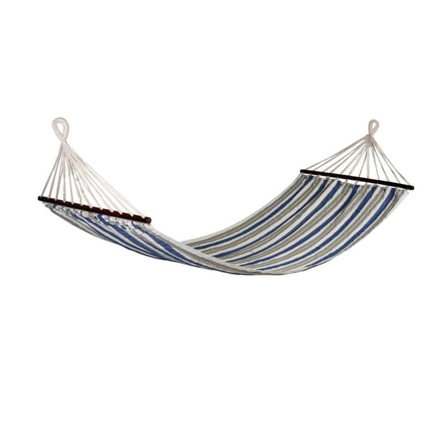 Hengekøye RIINA blå stripet. Sengedelen av hengekøyen er laget av bomullsstoff. Målene på stoffdelen er 85x190cm, målene på tredelen er 80x2,5cm. Maksimal lastekapasitet 120 kg. Husken kan monteres mellom to trær eller stolper.Les mer om produktet