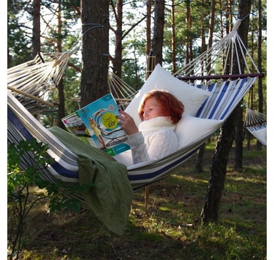 Hengekøye RIINA blå stripet. Sengedelen av hengekøyen er laget av bomullsstoff. Målene på stoffdelen er 85x190cm, målene på tredelen er 80x2,5cm. Maksimal lastekapasitet 120 kg. Husken kan monteres mellom to trær eller stolper. Det er også mulig å bruke et spesielt stativ for å henge husken opp. Avstanden mellom festepunktene skal være minst 25-30 cm lengre enn hengekøyens totale lengde. PLEIE: for å forlenge levetiden til produktet, beskytt det mot vær og vind. Ikke la hengekøyen stå i sol eller regn over lengre tid. Holdbarheten til stoffet og snorene reduseres på grunn av UV-stråling og overdreven fuktighet, og fargene blekner. Hvis mulig, ta ned hengekøyen etter bruk og oppbevar den i et tørt, godt ventilert rom. La hengekøyen tørke helt før du oppbevarer den. Håndvask er tillatt i vann opptil 40 grader. Bruk kun milde vaskemidler.