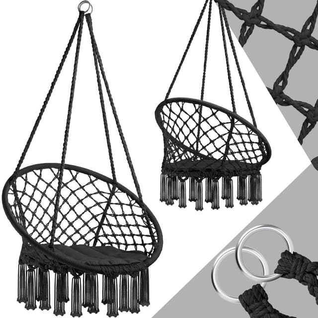 Sett deg i den bekvemme hengestolen fra tectake og svev bort fra hverdagsstresset. Den lette bomullsflettingen og den myke sitteputen tilpasser seg perfekt til kroppen. Den robuste huskestolen er svært komfortabel og er dessuten fin og behagelig å se på med pyntedusker på undersiden av setet. Den lette vekten gjør at den robuste hengestolen nesten kan tas med overalt. Nyt en spennende bok eller en god rødvin ute i naturen i den koselige hengestolen fra tectake.