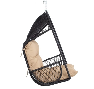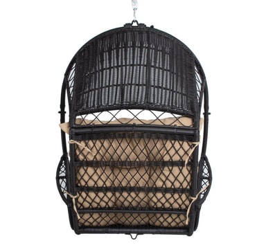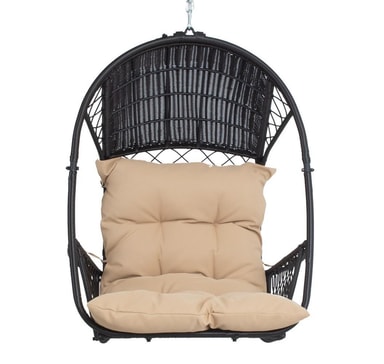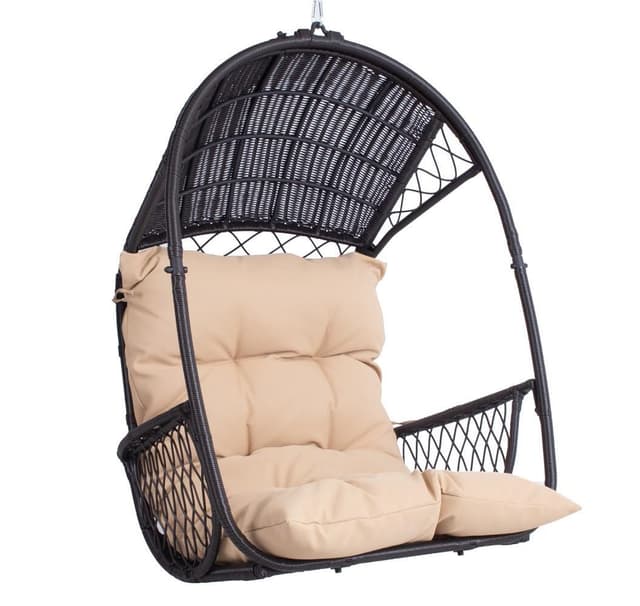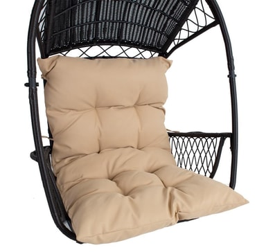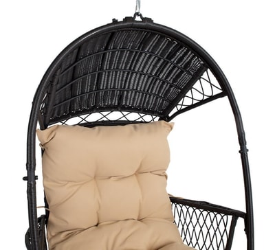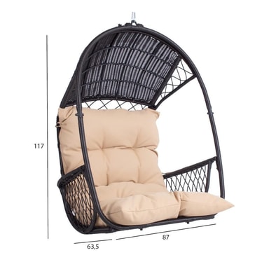 Hengestol TANJA mørkebrun. Hengestolen gir en ideell mulighet til å slappe av og slappe av. Den komfortable og myke beige puten er inkludert i settet. Stålrammen på stolen er dekket med mørkebrunt plastflettverk. Hengestolen måler 187x63,5x117cm. Den 24,5 cm lange kjeden og fjæren for oppheng er inkludert. VEDLIKEHOLD: hengestolen bør ikke overlates til sol eller regn over lengre tid fordi det forkorter produktets levetid. Produktet bør oppbevares i et tørt og skyggefullt rom. FORSIKTIG: produktet er ikke ment å brukes i sterk vind eller regn.