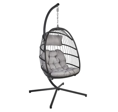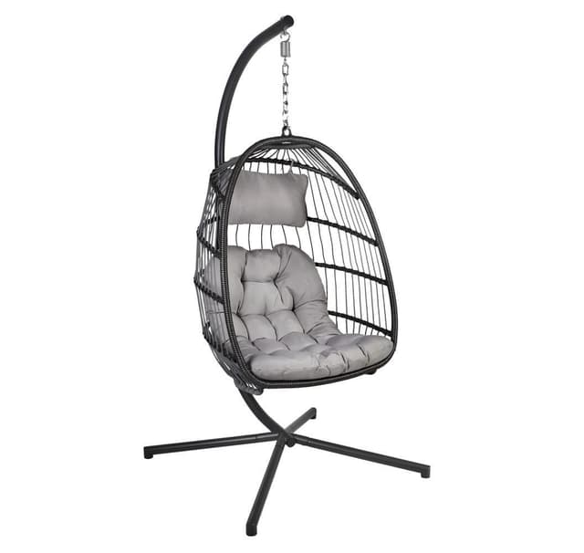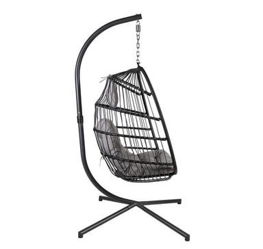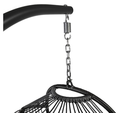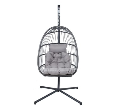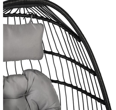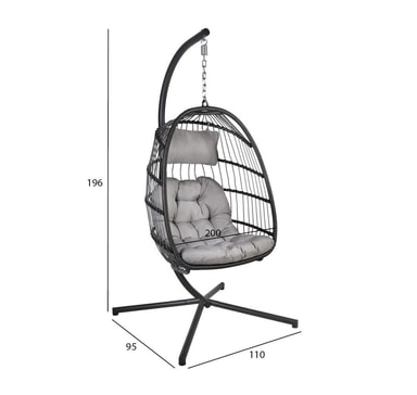 Hengestol YOYO grå. Hengestolen gir en ideell mulighet til å slappe av og slappe av. De komfortable og myke putene er inkludert i settet. Aluminiumsrammen på stolen er dekket med grå plastfletting. Stålstativet er dekket med sort pulverlakk. Hengestolen måler 100x95/110xH196cm og vektgrensen er 130kg. VEDLIKEHOLD: hengestolen bør ikke overlates til sol eller regn over lengre tid fordi det forkorter produktets levetid. Produktet bør oppbevares i et tørt og skyggefullt rom. FORSIKTIG: produktet er ikke ment å brukes i sterk vind eller regn.