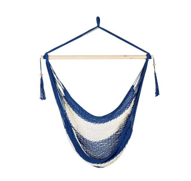 Huskestol CARINA, blåstripet. Setet på hengestolen er laget av bomullssnor. Lengden på hengestokken i tre er 100x3,2 cm. Maksimal lastekapasitet 100 kg. Hengestolen kan henges på en sterk tregren eller bjelke. Det er også mulig å bruke et spesielt stativ for å henge husken opp. PLEIE: for å forlenge levetiden til produktet, beskytt det mot vær og vind. Ikke la husken stå i sol eller regn over lengre tid. Holdbarheten til stoffet og snorene reduseres på grunn av UV-stråling og overdreven fuktighet, og fargene blekner. Ta om mulig husken ned etter bruk og oppbevar den i et tørt, godt ventilert rom. La husken tørke helt før du oppbevarer den. Håndvask er tillatt i vann opptil 40 grader. Bruk kun milde vaskemidler.