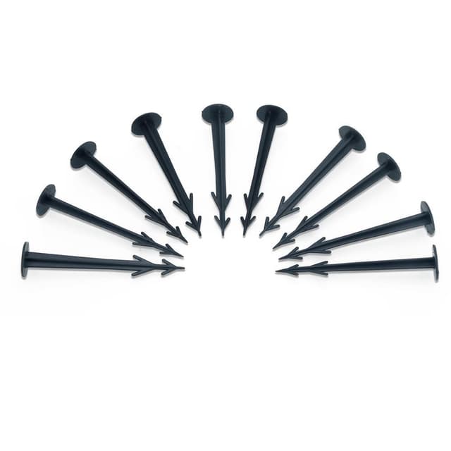 For feste av geotekstiler og andre materialer til gulvet i uteområdet som f.eks Eks.: Hagefleece, jordstoff, beskyttelsestrekk for planter for å beskytte mot frost, garn, kunstgress, telt og presenninger. Mothakene på spissen hindrer at spikeren skyves ut etter at den er festet i bakken. Det flate spikerhodet holder tekstilene flatt på gulvet. Plasten er værbestandig og det er ingen fare for rust. Pinnene er ufølsomme for fuktighet, mugg og sollys. Du vil motta en boks med 100 jordankre av plast.