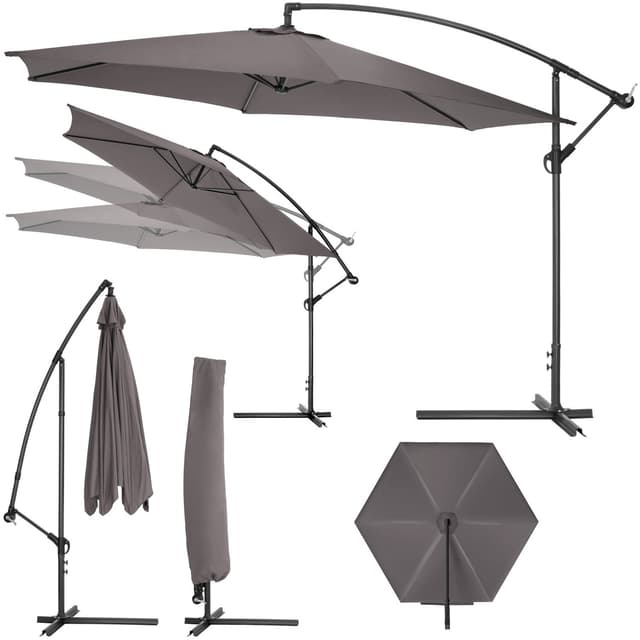Denne utendørs parasollen fra tectake har hele 3,5 meter i diameter og vil garantert gi nok skygge for dine behov. Parasollen har et sveivkabelsystem for enkelt å åpne opp skjermen. Beskyttelseshylsen som følger med kan trekkes over hele parasollen når den er slått ned eller bare skyves over materialet for optimal beskyttelse mot støv og vær. Få denne stabile parasollen fra tectake som et perfekt tillegg til hagen eller terrassen din.