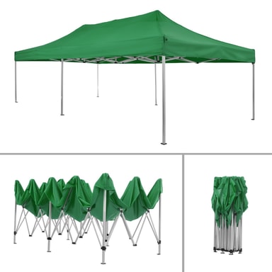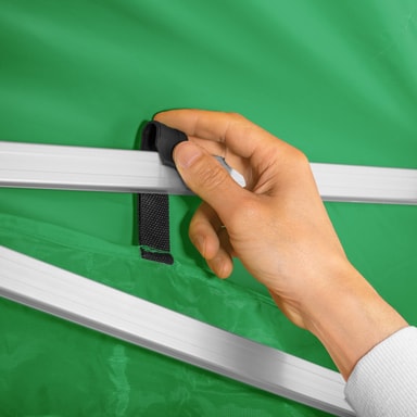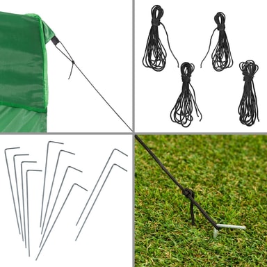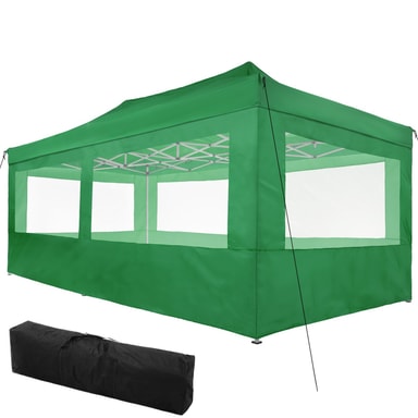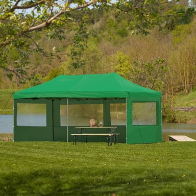 Slapp av med naturen som kulisse under taket i paviljongen fra tectake. På noen få minutter er den lette sakserammen klar til bruk på grunn av det enkle klikksystemet. Taket og veggene festes på de robuste stengene ved hjelp av kroker og borrelås. Høyden på den rustfaste og vanntette paviljongen kan varieres etter behov. Klappteltet kan pakkes kompakt vekk i den medfølgende vesken, for enkel transport eller plassbesparende oppbevaring. En gjennomtenkt konstruksjon: Den funksjonelle paviljongen fra tectake.