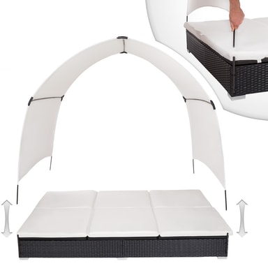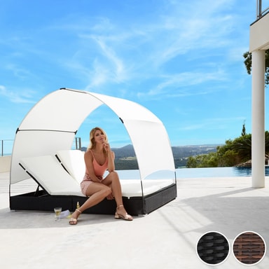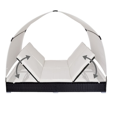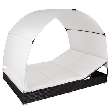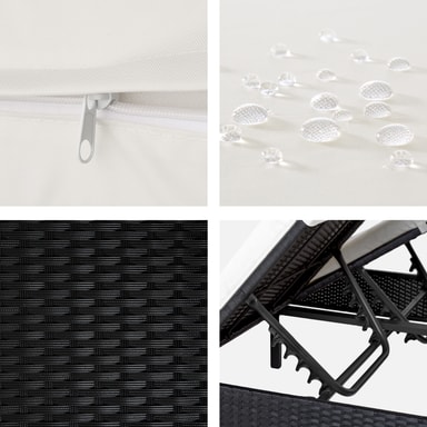 Med denne høykvalitative kunstrottingloungebenken for 2 personer med soltak kan du forvandle hagen, terrassen, uterommet, balkongen eller spaavdelingen til en avkoblende oase. De svært bekvemme, myke liggeunderlagene i polyester er fantastisk fargekoordinert med kunstrottingsolstolen og utstyrt med hurtiglås på baksiden, slik at dynene lett kan rengjøres. For å beskytte dynene mot gjennomfuktning er overflaten impregnert. Slik renner smuss og vanndråper enkelt av.