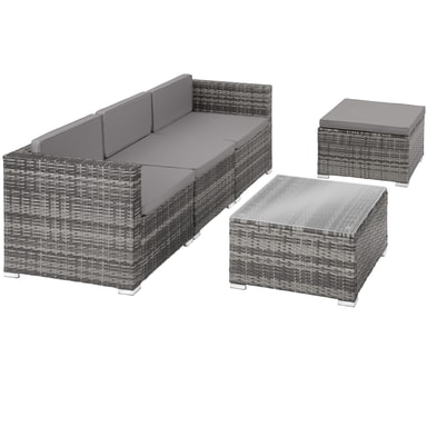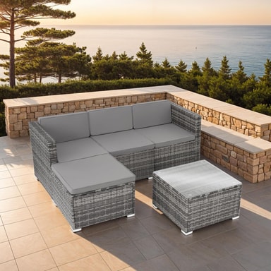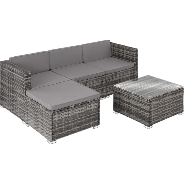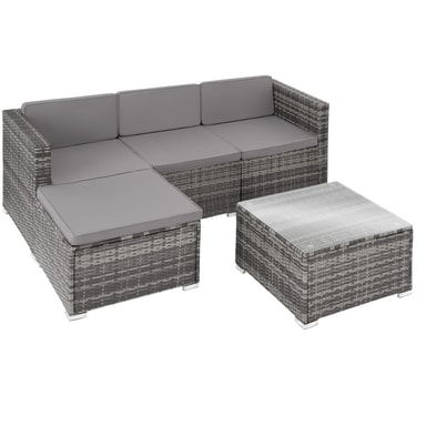 Bring komfort til terrassen, balkongen eller hagen din med den koselige rotting solsengen Lignano fra tectake. Den sjenerøse setedybden og de komfortable putene skaper en atmosfære som inviterer deg til å slappe godt av. Hvert element i det moderne settet kan kombineres fleksibelt med hverandre og kobles sikkert sammen med de praktiske festeklipsene. Det lave bordet med solid topp laget av herdet sikkerhetsglass tilbyr et praktisk sted å oppbevare forfriskninger og snacks - gjenoppdag sommeren med dette allsidige ensemblet fra tectake.