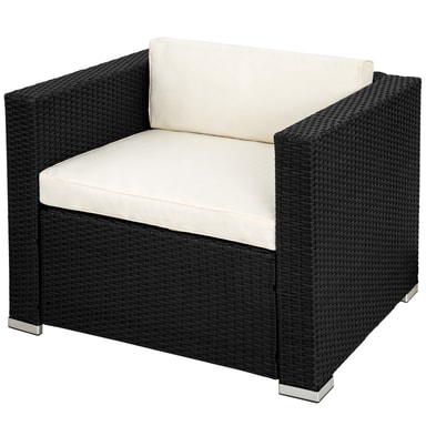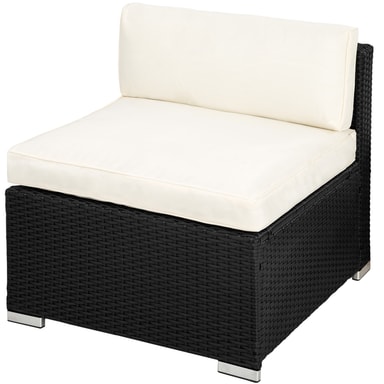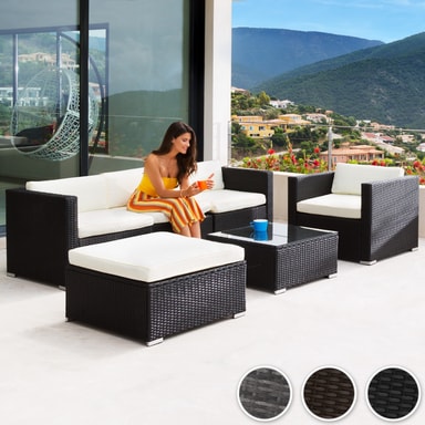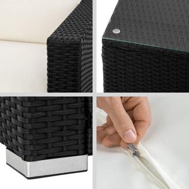Bord, sofa og armstol er dekket i kunstrotting. Bordoverflaten i glass gir et svært elegant inntrykk og er svært enkel å rengjøre. De bekvemme sitteputene i polyester er godt fargekoordinerte med møblene og har en glidelås på baksiden, slik at dynene enkelt kan rengjøres. For å beskytte dynene mot gjennomfuktning er overflaten impregnert. Slik renner smuss og vanndråper enkelt av (se bilde). Med de ulike deleementene kan møblene arrangeres helt etter dine behov.