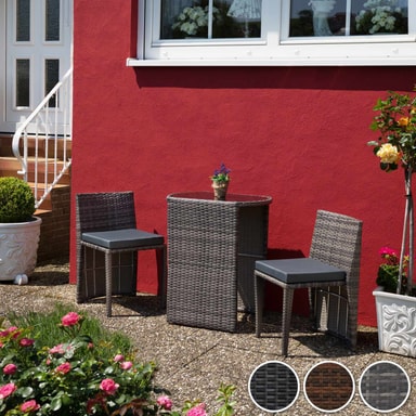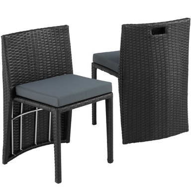 Dette elegante rottingsettet fra tectake passer perfekt til måltider, avslapping og samtaler ute i det fri. Bordet og de to stolene med bekvemme og vannavvisende sitteputer leveres ferdig montert. Den flotte rottinggruppen er plassbesparende og kan skyves sammen når den ikke er i bruk. Det fine og slitesterke flettverket i polyrotting og den stabile rammen i aluminium gjør at dette rustfrie møbelsettet er perfekt til utendørsbruk. Lite, lett og koselig: Det innbydende rottingsettet fra tectake kombinerer gjennomtenkt design med hyggelig utstråling.