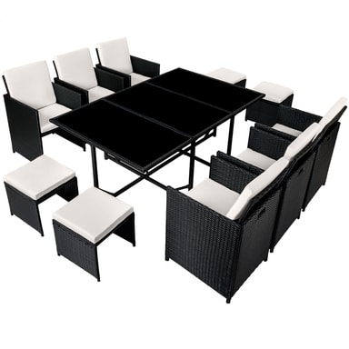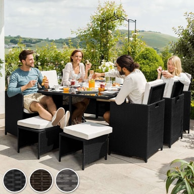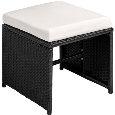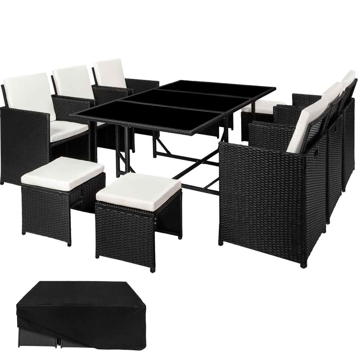 Rottingmaterialet som anvendes (vide) er utviklet spesielt for hagemøbler. Polyrotting er et samlenavn for alle tilvirkede vevde materialer av polyetylen, som er et industrielt produsert alternativ til naturlig rotting. Dine nye møbler er vaskbare, lette å rengjøre og motstandskraftige mot forvitring. De vatterte hvitfargede putene er vannavvisende og overtrekkene kan forkortes ved hjelp av de isydde glidelåsene som dermed blir lette å rengjøre. Den herdete glasskiven er svartmalt lengst ned, noe som gir en luksuriøs look. Stolene har på kantene et håndtaksuttak og kan derigjennom lett og enkelt forflyttes. Gjennom sammenleggbare ryggstøtter er armstolene og pallen lett å stable sammen i byggkassesystemet, noe som er plassbesparende. Den medfølgende regnbeskyttelsen gir ekstra beskyttelsen og forlenger gleden med denne sittegruppen.