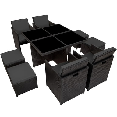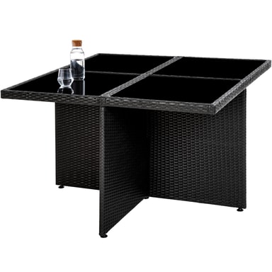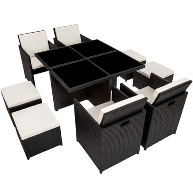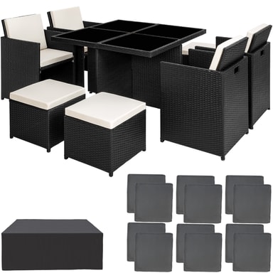 Uansett om de skal brukes i hagen eller innendørs: Våre aluminium-kunstrottingmøbler kan brukes fleksibelt og løfter hagen, terrassen, uterommet og stuen. Behagelige stoler og det elegante bordet innbyr til koselige stunder. Rottingsetet er ikke bare elegante, men imponerer også gjennom hele sin lange livslengde. Den lave vekten gjør det praktisk å transportere møblene. Bordoverflaten i glass med 4 delsegmenter gir et svært elegant inntrykk og er ekstremt lettrengjort. De svært bekvemme beige sitteputene i polyester er godt fargekombinerte på kunstrottingen og har glidelås på baksiden for enkel rengjøring av overtrekket. For å beskytte dynen mot gjennomfuktning er overflaten impregnert. Slik renner smuss- og vanndråper enkelt av.