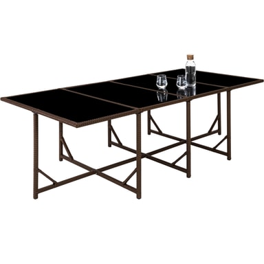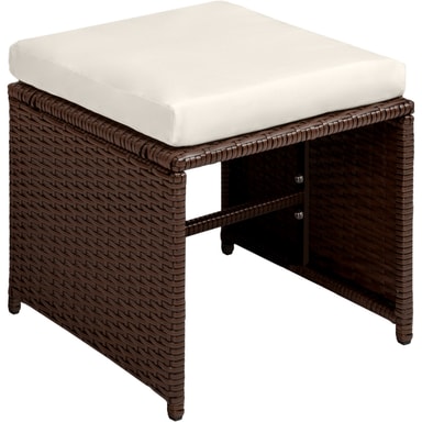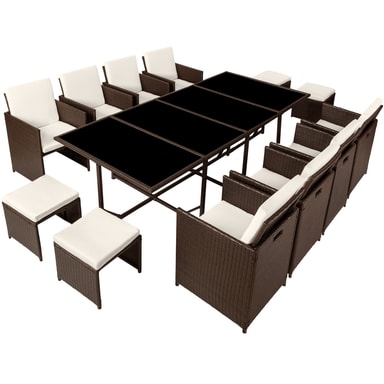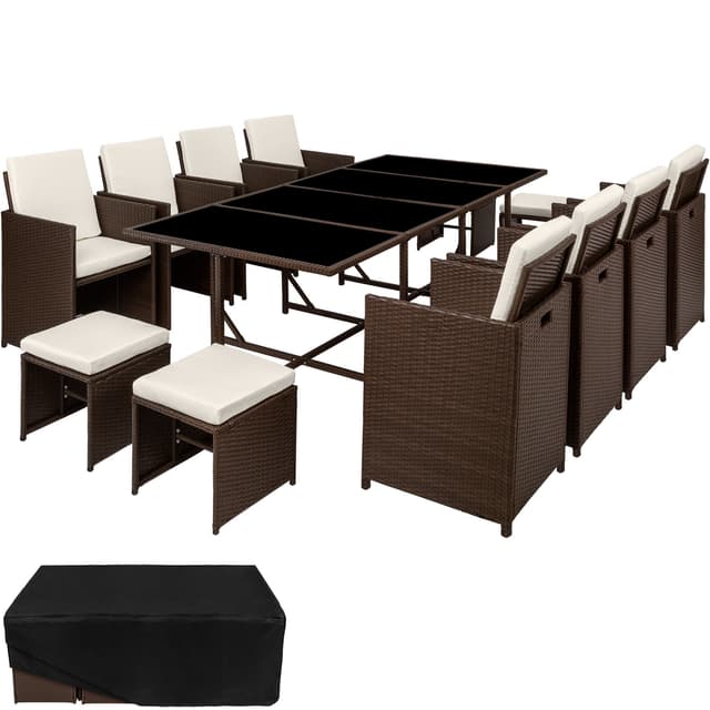 Rottingmaterialet som anvendes (vide) er utviklet spesielt for hagemøbler. Polyrotting er et samlenavn for alle tilvirkede vevde materialer av polyetylen, som er et industrielt produsert alternativ til naturlig rotting. Dine nye møbler er vaskbare, lette å rengjøre og motstandskraftige mot forvitring. De vatterte hvitfargede putene er vannavvisende og overtrekkene kan forkortes ved hjelp av de isydde glidelåsene som dermed blir lette å rengjøre. Den herdete glasskiven er svartmalt lengst ned, noe som gir en luksuriøs look. Stolene har på kantene et håndtaksuttak og kan derigjennom lett og enkelt forflyttes. Gjennom sammenleggbare ryggstøtter er armstolene og pallen lett å stable sammen i byggkassesystemet, noe som er plassbesparende. Den medfølgende regnbeskyttelsen gir ekstra beskyttelsen og forlenger gleden med denne sittegruppen.