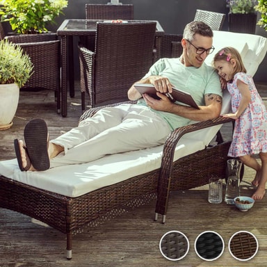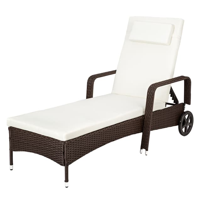 Ideell loungestol for spaelskere og for stilbevisste soltilbedere! Koble av og ta det rolig! Såvel i hagen som på terrassen. Det absolutte blikkfanget også for balkongen, badstuen eller spaet. En elegant design med enkle former og innovativ kombinasjon av materialer gjør stolen også visuelt perfekt. Denne stolen skaper en herlig atmosfære. Gummierte hjul i fotenden sikrer lett transport. Ryggstøtten er justerbar i 6 posisjoner og kan således stilles inn avhengig av solen. Den robuste aluminiumstommen og den lettstelte polyrottingen egner seg optimalt såvel for utendørsbruk som innendørs. En annen trivelig funksjon er bekvemt, avtakbar skumdyne og separat hodepute.
