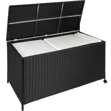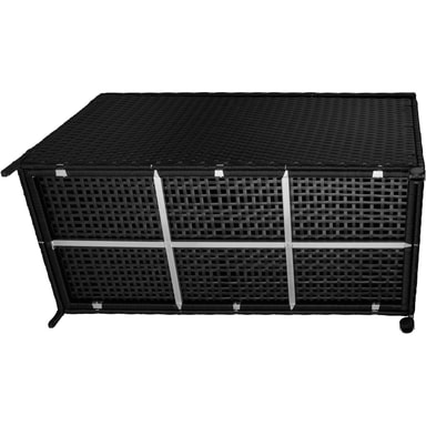 Den stabile dynekassen i klassisk design av komfortabel og lettstelt kunstrotting garanterer mye oppbevaringsplass for dine sittedyner, puter og andre hagetilbehør. Stativet er tilvireket av pulvermalt aluminium og er ekstra robust. De to praktiske hjulene og håndtaket gjør kassen lett å transportere.