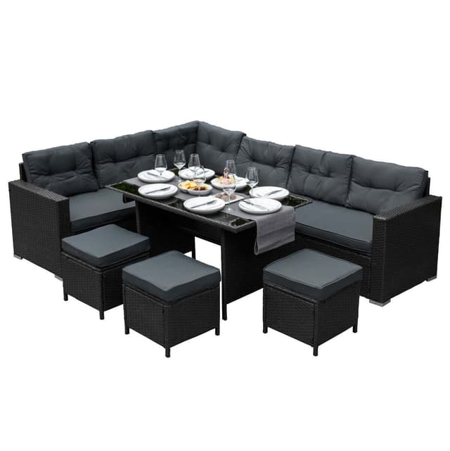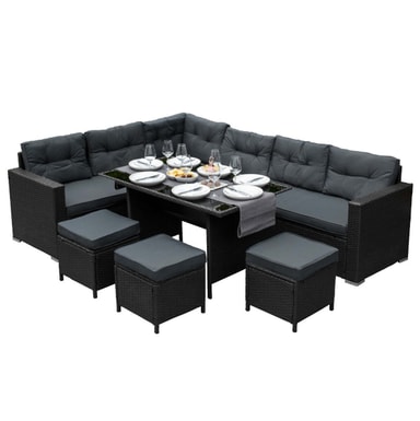 Designet for maksimal stil og komfort, består dette utsøkte spisestuesettet av en hjørnesofa, 3 krakker og et glassbord. Med plass til ni personer, er dette settet det perfekte midtpunktet for enhver hagefest eller utendørsmiddag.