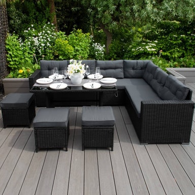 Med en slående svart rottingfinish og forskjøvet med ekstra tykke grå puter, gir settet et moderne og luksuriøst preg til hagen din. Med tillegg av et UV-beskyttende belegg kan du være sikker på at møblene dine vil være beskyttet mot vær og vind hele året, noe som bidrar til å opprettholde den vakre fargen.