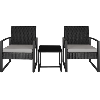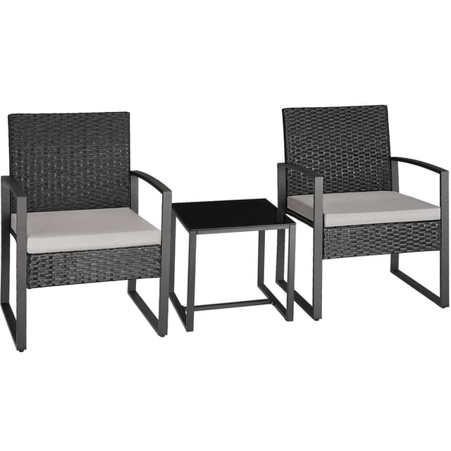 Den innbydende rotting sittegruppen for to personer fra tectake passer utmerket til hagen, balkongen eller terassen din. De slanke stålrammene, det fine flettverket og de komfortable putene er visuelt perfekt koordinert og imponerer med sin store holdbarhet og lave rengjøringskrav. På den robuste sikkerhetsglassplaten i stilig sort er deilig kaffe, smakfulle snacks og spennende lesestoff alltid innen rekkevidde. De høydejusterbare føttene sørger alltid for presis balanse, selv på ujevne gulv - unn deg sommerlige øyeblikk av nytelse på terrassen, balkongen eller på landet med det koselige hagesettet fra tectake.