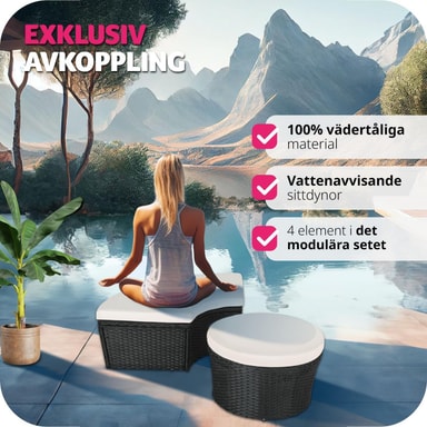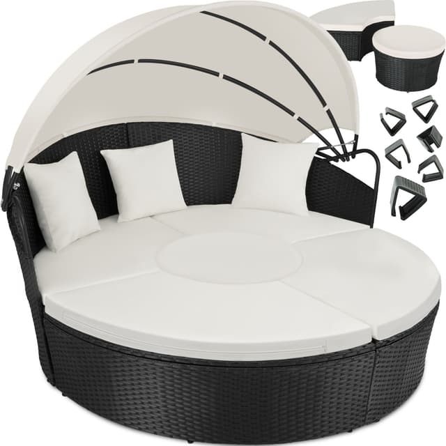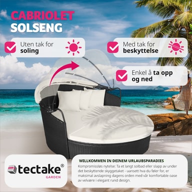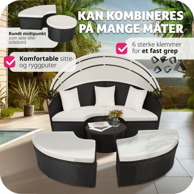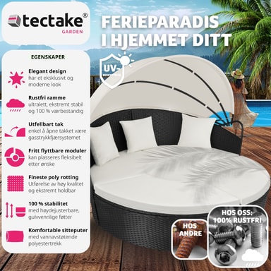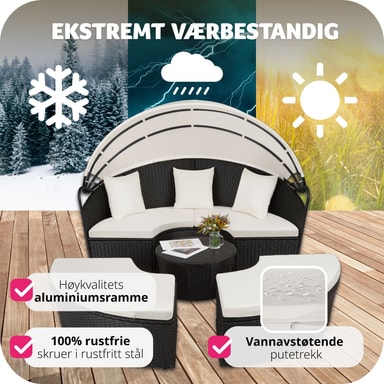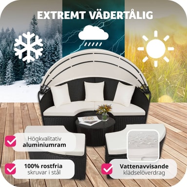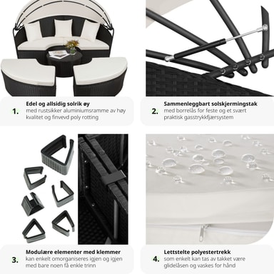 Med denne soløyen i aluminium og poly rotting forvandler du hagen, terrassen, vinterhagen, balkongen eller hjemmespaet til en herlig oase. Solfylte dager gir det uttakbare solbeskyttelsestaket praktisk skygge og beskytter mot vind. Du kan bruke den som praktisk sofagruppe med plass for venner eller som en behagelig dagseng. Du kan lett modifisere soløyen av rotting slik at den passer dine behov - et must i ditt eget hjemmespa.