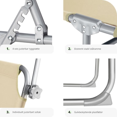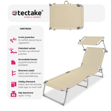 Nyt sommeren fullt ut med den behagelige og praktiske solsengen til hagen og stranden fra tectake. Den smarte solsengen er den ideelle ledsager til fritid og ferie og til å slappe av i og nyte livet. Med den innebyggede solskyggen er det mulig å solbade eller å nyte en god bok i din helt egen private skygge. De to håndtakene gjør det også enklere å transportere solsengen. Få fingrene i denne fantastiske solsengen og vær sikret den beste plassen på stranden!
