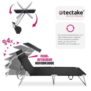 For maksimal sommerkos kombinerer denne allsidige solsengen fra tectake høy funksjonalitet med en robust design. Du er garantert maksimal avslapning takket være et ryggstø som kan justeres i 4 trinn, et fleksibelt, justerbart soltak, en myk hodepute og en behagelig liggeflate. Den pulverbelagte stålrammen med tre ben gir den lettstelte konstruksjonen ekstremt god stabilitet og beskyttelse mot tipping. Den enkle foldemekanismen, de ideelle målene for sammenlegging og det praktiske bærehåndtaket gjør den lette solsengen fra tectake ideell å ha med seg på tur.