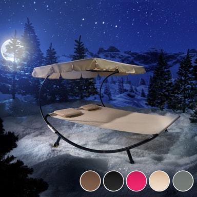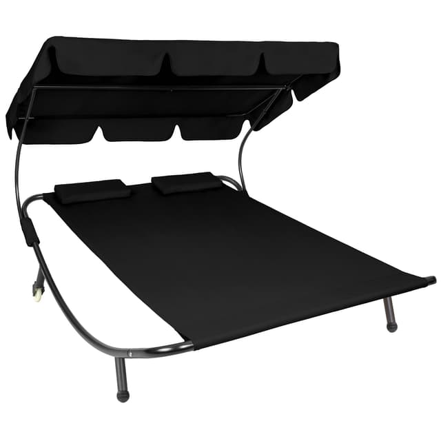Den luksuriøse solsengen for to personer fra tectake er den mest komfortable måten å tilbringe avslappende timer i hagen din. Enten du bare vil gå deg vill i tankene eller slappe av som et par eller med en venn. Solsengen er egnet for innendørs og utendørs bruk og er lett å flytte takket være bakhjulene. Den solide metallrammen til solsengen tåler opptil 200 kg. På grunn av tekstilets lettstelte væskeavvisende belegg, holdes solsengen veldig lett fri for smuss. Denne doble solsengen kommer med en ekstra stor solskjerm som sørger for skyggefull og kjølig avslapning selv når solen banker ned. Gjør deg klar for sommeren med denne doble solsengen fra tectake.