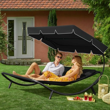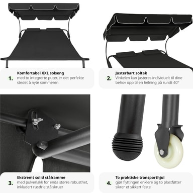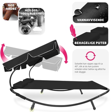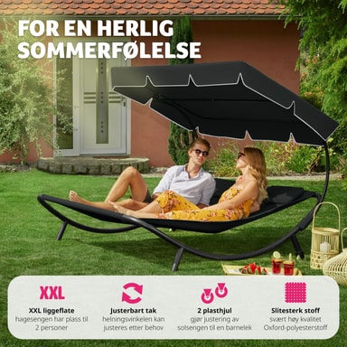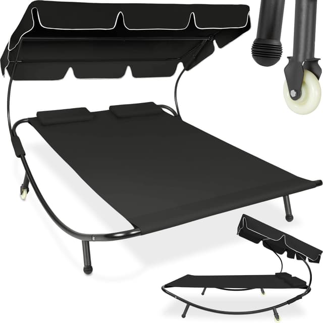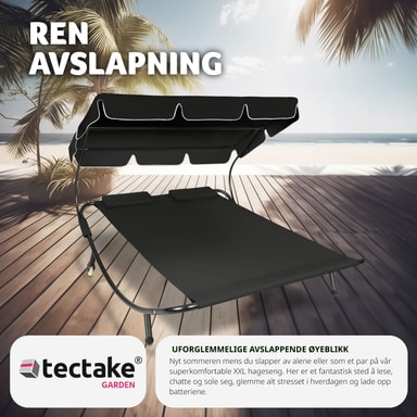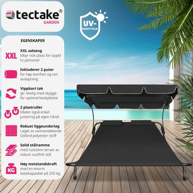 Den luksuriøse solsengen for to personer fra tectake er den mest komfortable måten å tilbringe avslappende timer i hagen din. Enten du bare vil gå deg vill i tankene eller slappe av som et par eller med en venn. Solsengen er egnet for innendørs og utendørs bruk og er lett å flytte takket være bakhjulene. Den solide metallrammen til solsengen tåler opptil 200 kg. På grunn av tekstilets lettstelte væskeavvisende belegg, holdes solsengen veldig lett fri for smuss. Denne doble solsengen kommer med en ekstra stor solskjerm som sørger for skyggefull og kjølig avslapning selv når solen banker ned. Gjør deg klar for sommeren med denne doble solsengen fra tectake.