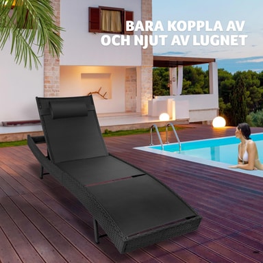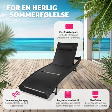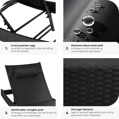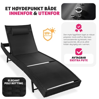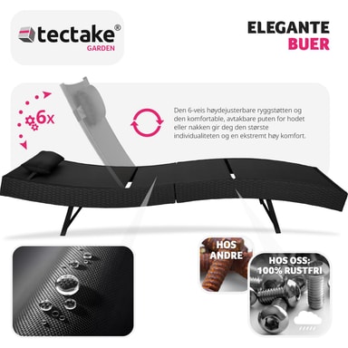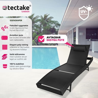 Denne vakre og komfortable solsengen i polyrotting fra tectake vil gjøre at du er godt forberedt til å nyte solfylte timer i hagen, på terrassen eller balkongen. Solsengen er egnet for innendørs og utendørs bruk og vil se bra ut i et hjemmespa. Solsengens ryggstøtte kan justeres i 5 trinn, fra oppreist til helt tilbakelent. Takket være stolens lenefunksjon kan du sikre at du alltid er best posisjonert for å nyte solens stråler. Polyrottingvevingen til disse hagemøblene er spesielt egnet for utendørs bruk, siden den er smussavvisende og lett å rengjøre. Tilbehøret til solsengene inkluderer en liten hodepute, som hjelper deg å finne en komfortabel liggestilling. Enten du er i hagen din eller på terrassen din, vil denne solsengen fra tectake tillate deg å slappe av og slappe av i komfort.