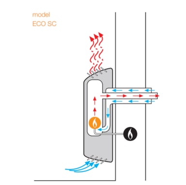 Ovnen brenner med balansert avtrekk: den tar forbrenningsluften utenifra og avgassene slippes ut gjennom vegg. Siden ovnen ikke forbruker av rommets oksygen er den sikker å installere i soverom og oppholdsrom. Eco30 er egnet for litt større rom og hytter da den har forholdsvis høy effekt. Komplett veggjennomføring for trevegg medfølger ovnen. (Merk: ikke for fjernstyring).