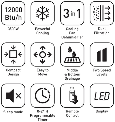APT Cool 12000 er et bærbart 3-i-1-klimaanlegg med 12000 BTU (3500 W) kjøleeffekt, ideelt for rom på 25-35 m². Den har kjøle-, vifte- og avfuktermodus, justerbar temperatur (16-31 °C), 24-timers timer og fjernkontroll, i tillegg til et innebygd luftfilter, sterk luftstrøm og lavt støynivå (≤ 65 dB) for effektiv og komfortabel bruk.