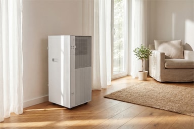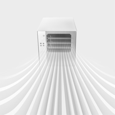 Enheten har et kompakt, moderne design med innebygd mobilitet, noe som gjør den enkel å flytte og plassere i ulike rom.