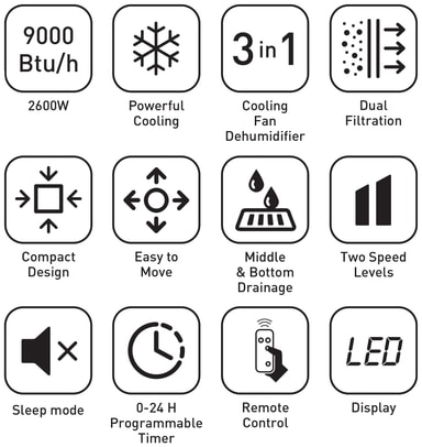 Med en kjøleeffekt på 9000 BTU (2600 W) leverer den effektiv kjøling for daglig komfort.